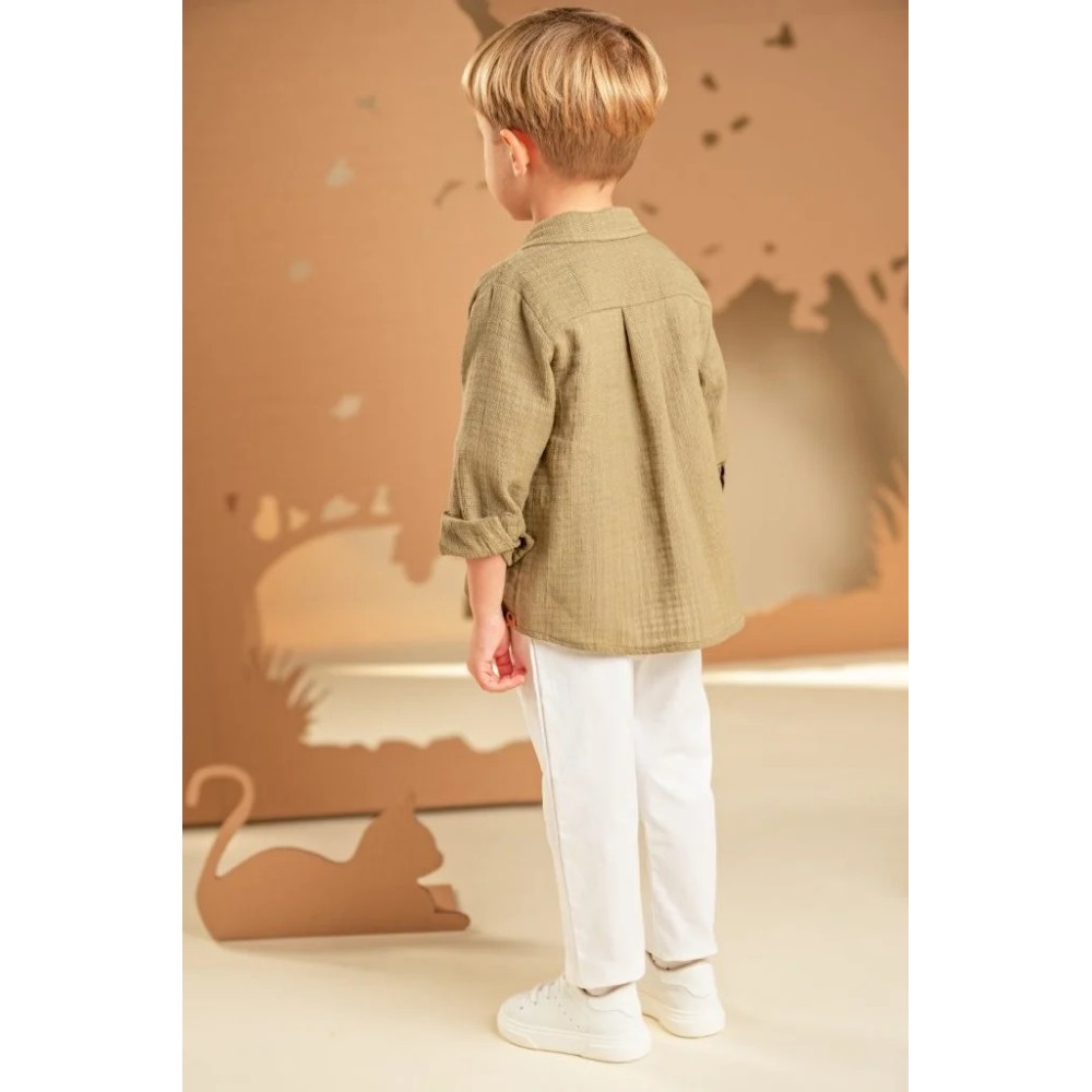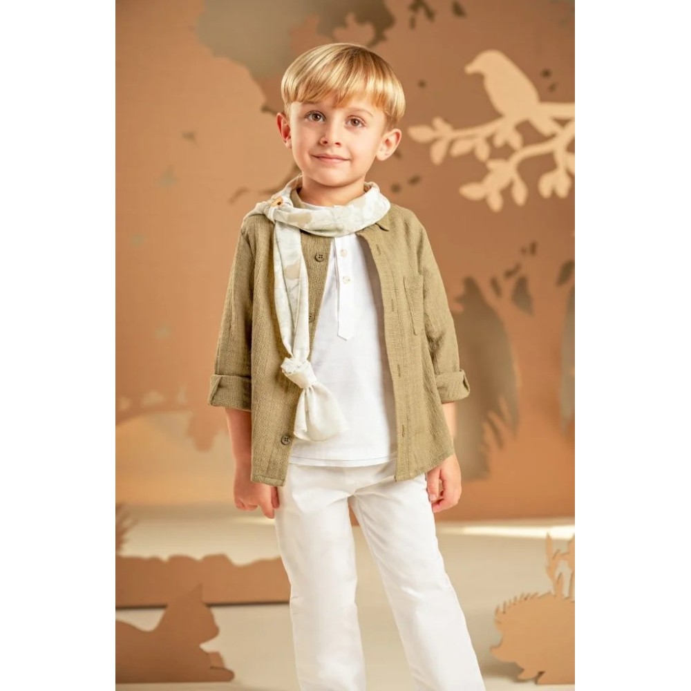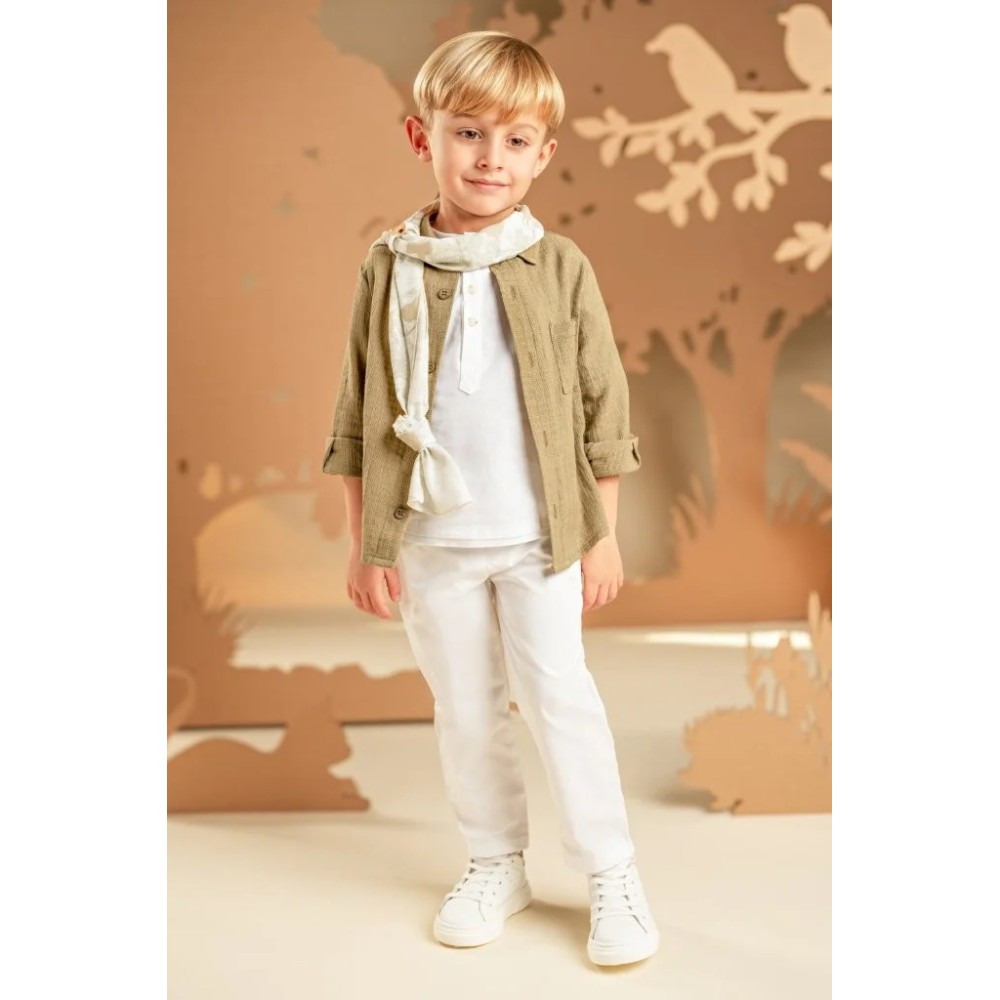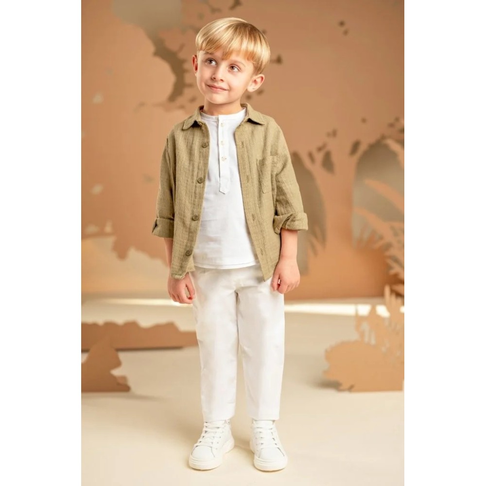 Ένα σύνολο με χαλαρή και σύγχρονη αισθητική, ιδανικό για όσους αγαπούν τις ξεχωριστές εμφανίσεις. Το παντελόνι από λευκή καμπαρντίνα συνδυάζεται με 100% λινή λευκή τουνίκ με πατιλέτα, προσφέροντας άνεση και δροσερή αίσθηση. Από πάνω, το πουκάμισο σε λαδί υπέροχο βαμβακερό υφαντό ύφασμα δίνει έμφαση στο layered look και την πρωτοτυπία της εμφάνισης. Το φουλάρι σε μπεζ αποχρώσεις με φλοράλ τύπωμα Baby Bloom exclusive συμπληρώνει το στυλ, ενώ ως τελική πινελιά μπορείτε να επιλέξετε ανάμεσα σε ψάθινο καπέλο ή υφασμάτινη τραγιάσκα, ανάλογα με το προσωπικό σας γούστο.