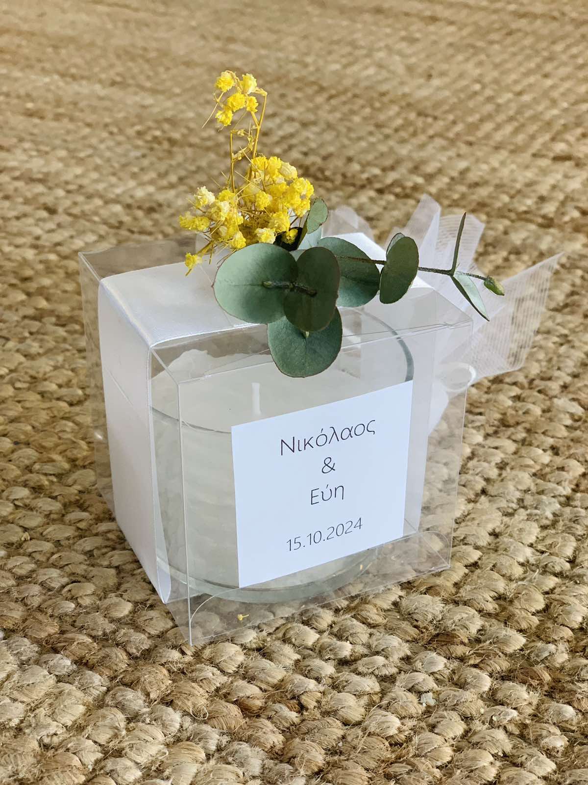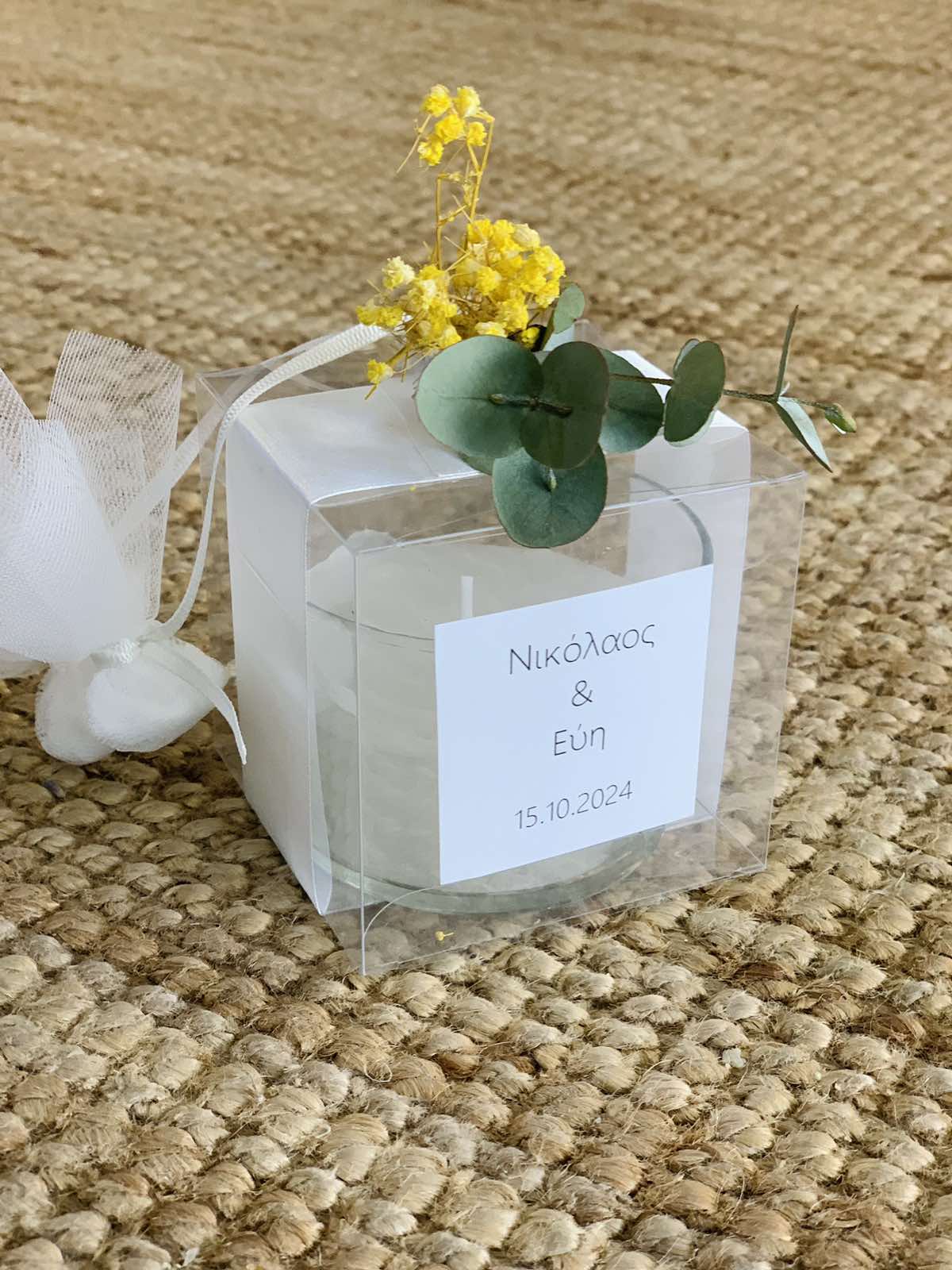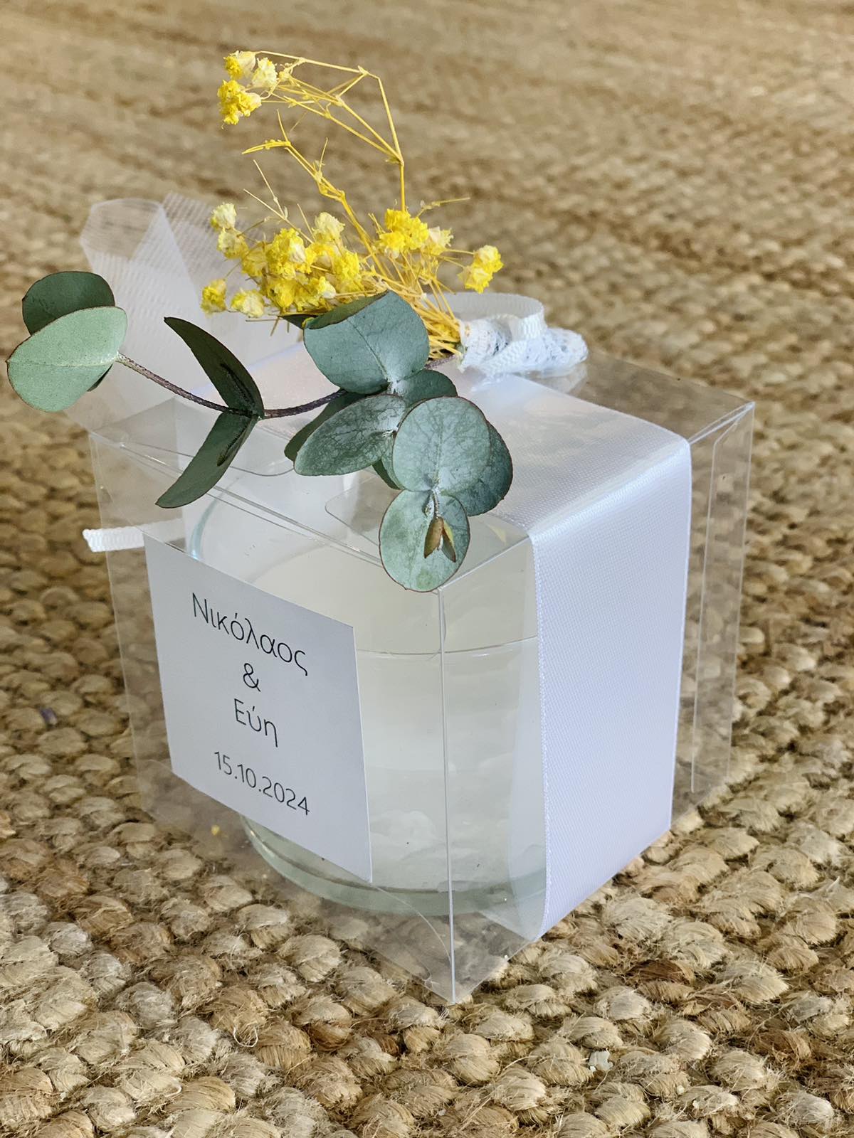 Μπομπονιέρα γάμου κερί (200ml) με διάφανο κουτί (8χ8cm) με αποξηραμένα άνθη γυψόφυλλο και ευκάλυπτο μαζί με αυτοκόλλητο των ονομάτων σας καθώς και την ημερομηνία σας αν επιθυμείτε.