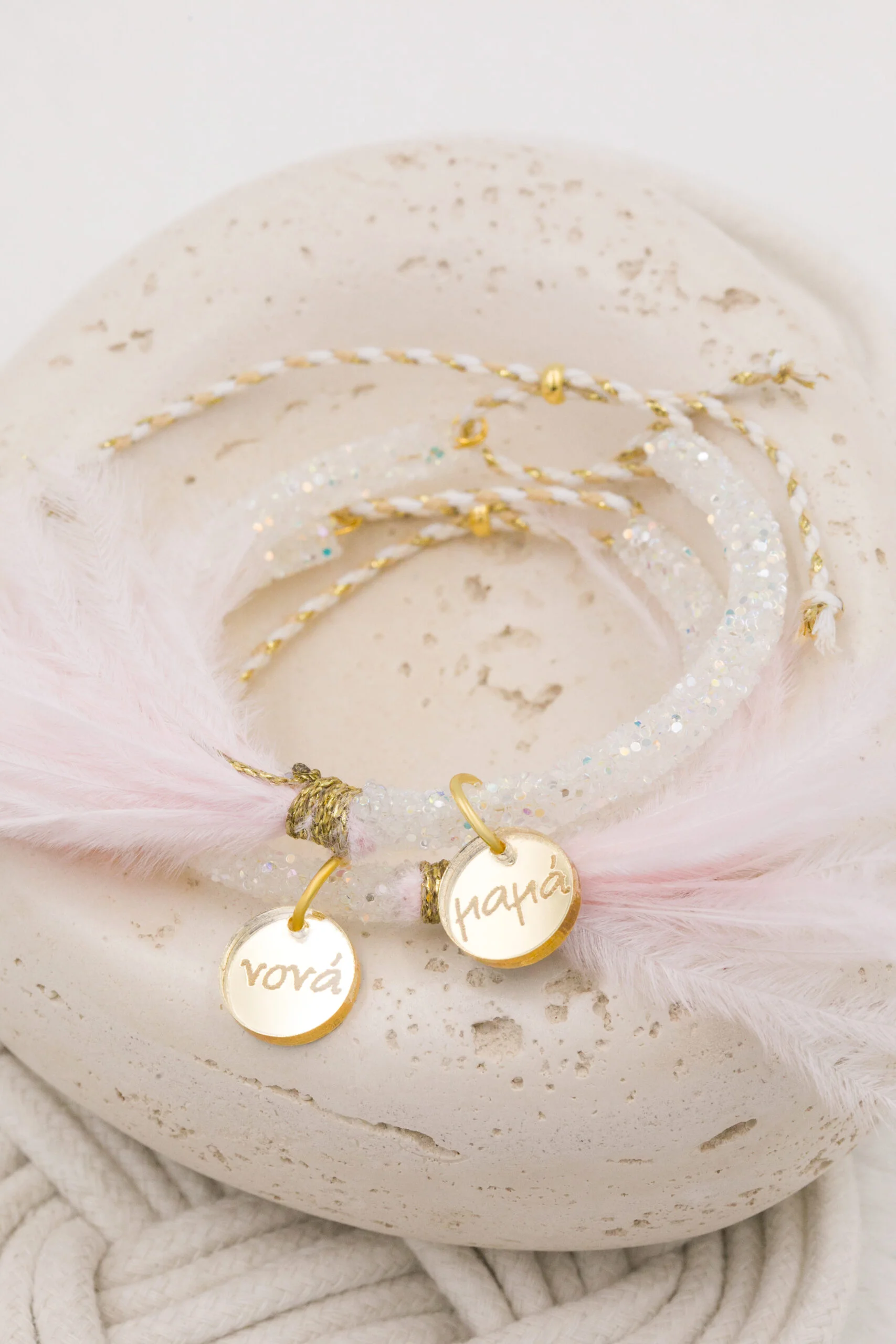 Βραχιόλι καουτσούκ με γκλίτερ φτερό ροζ plexiglass χρυσό καθρέφτη μαμά, νονά, γιαγιά, θεία, αδερφή. Οι φωτογραφίες έχουν υποστεί επεξεργασία και τα χρώματα ίσως να διαφέρουν λίγο στην πραγματικότητα. Η Τιμή αφορά συσκευασία 2 τεμαχίων.
