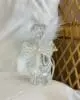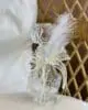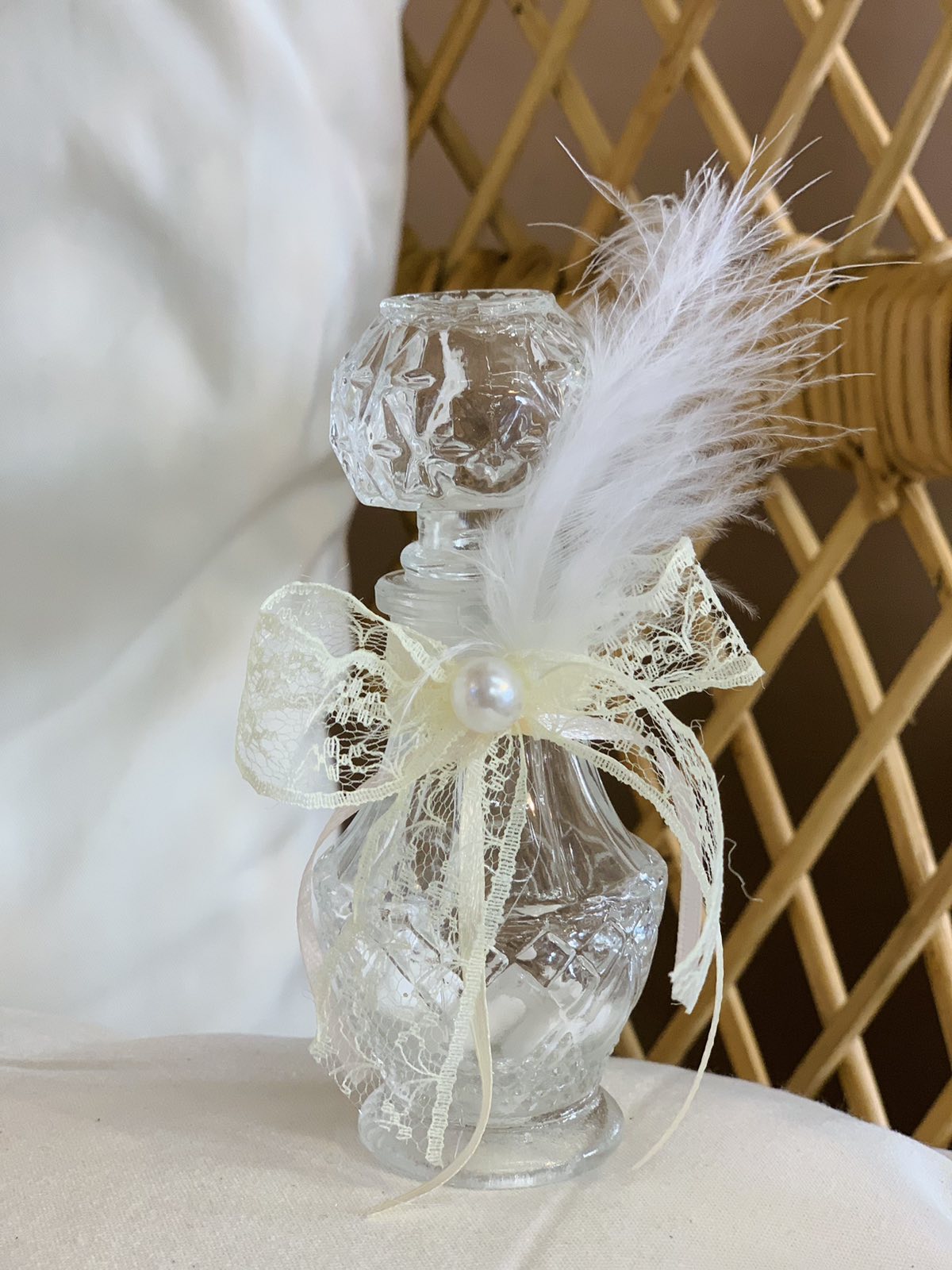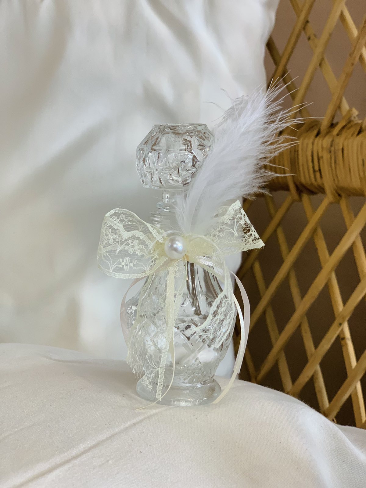Μπομπονιέρα γυάλινο καραφάκι (13,5cm) με κορδέλα – δαντέλα και πούπουλο
