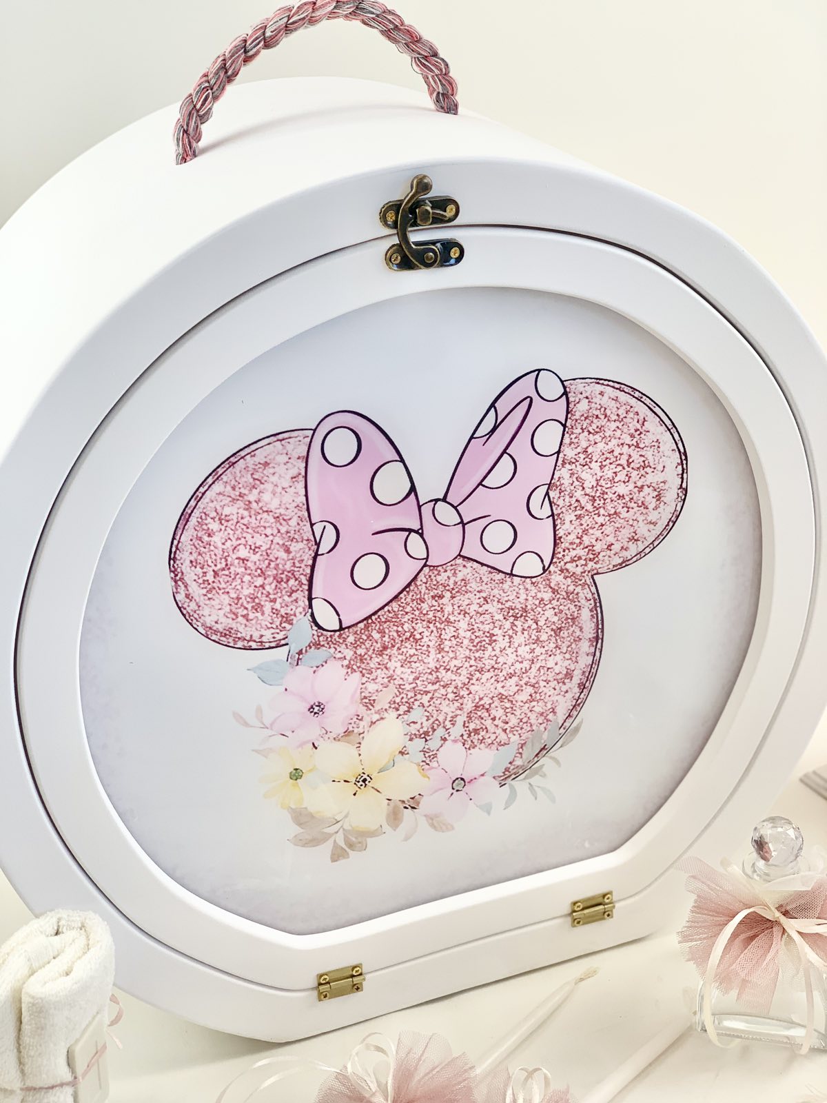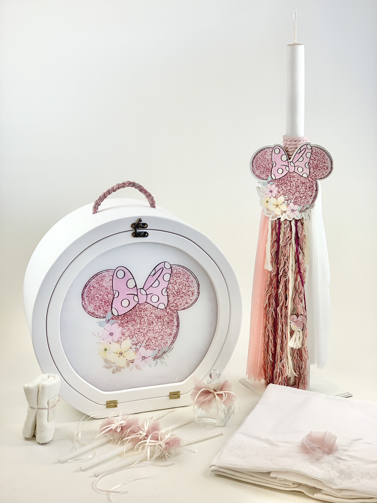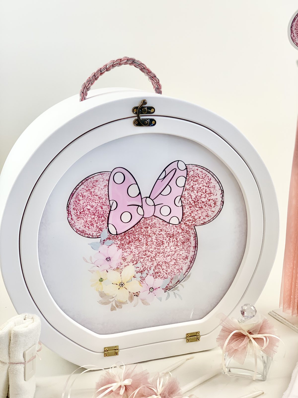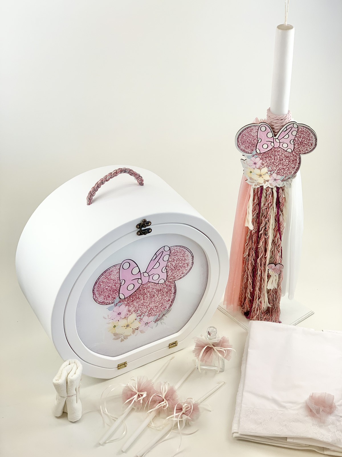 Σετ βάπτισης με θέμα minnie mouse μπαούλο με ψηφιακή εκτύπωση.