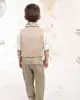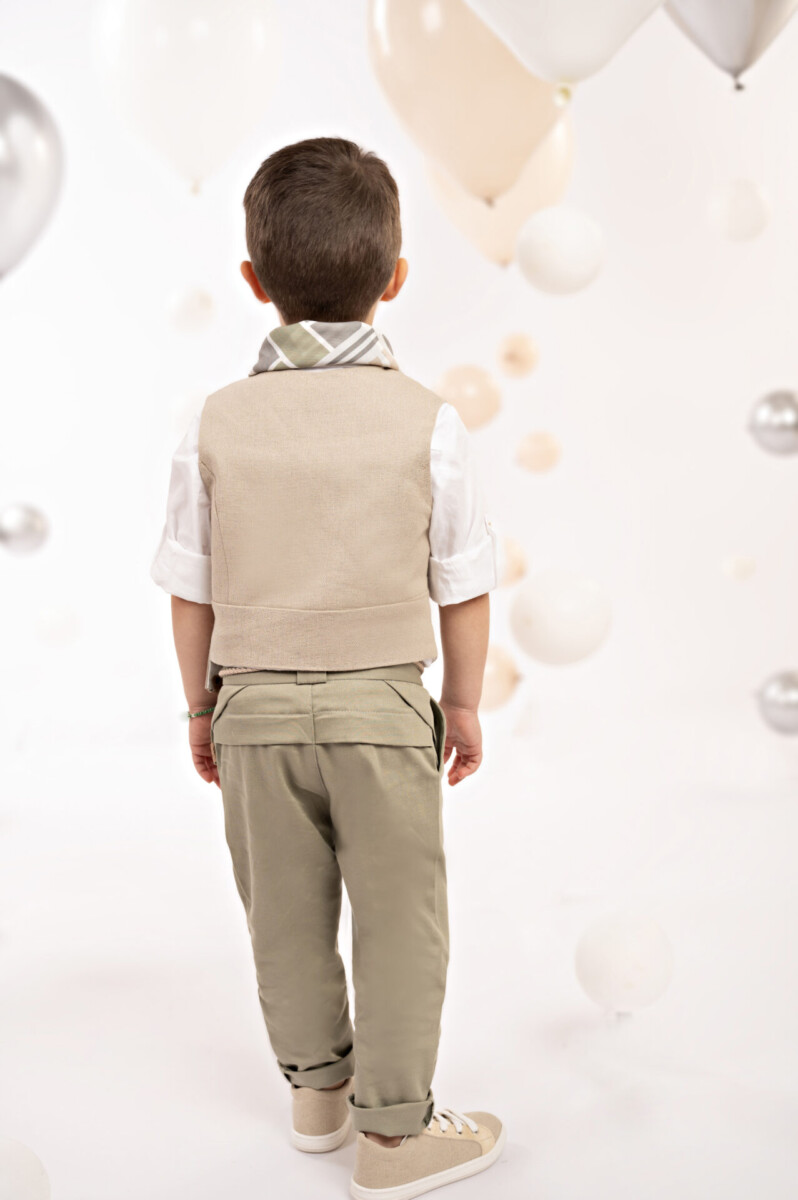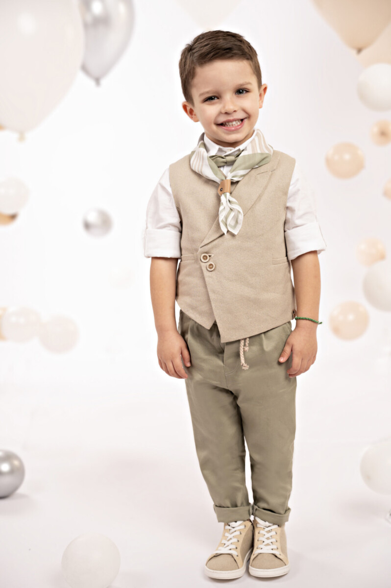 Ένα σύνολο που ξεχωρίζει για τις ιδιαίτερες γραμμές και τον κομψό συνδυασμό αποχρώσεων. Το παντελόνι, με το μοναδικό κόψιμο στο πίσω μέρος, είναι κατασκευασμένο από twill βαμβακερό ύφασμα σε mint απόχρωση, ενώ το σταυρωτό γιλέκο με λοξό κούμπωμα και φαρδύ μονό πέτο σε μπεζ βαμβακερό ύφασμα προσθέτει μια ξεχωριστή σχεδιαστική πινελιά. Το βαμβακερό πουκάμισο σε off white απόχρωση με τον κλασικό του γιακά δένει αρμονικά με το παπιγιόν και το personalized φουλάρι με γεωμετρικά σχέδια σε μπεζ-λαδί τόνους. Το σύνολο ολοκληρώνεται με τη ζώνη από μπεζ μελανζέ κορδόνι και το ψάθινο καπέλο ή τραγιάσκα (ανάλογα με την προτίμηση) δημιουργώντας ένα άψογο αποτέλεσμα.