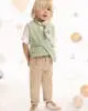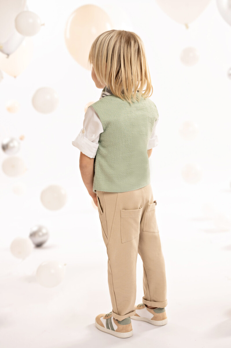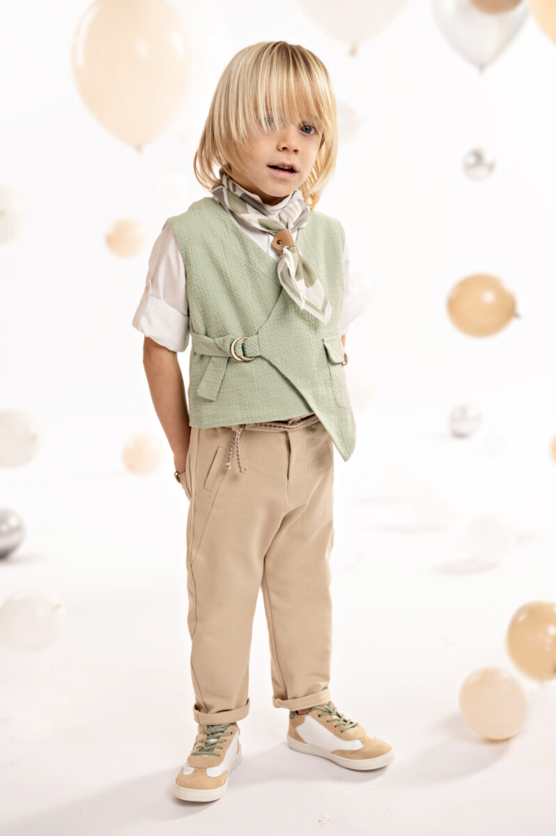 Ένα σύγχρονο και κομψό σύνολο, που συνδυάζει υφές και γραμμές με ξεχωριστό τρόπο. Το παντελόνι, σε μπεζ βαμβακερό jersey ύφασμα, διαθέτει ιδιαίτερα κοψίματα στο πλάι και εξωτερικές πίσω τσέπες, προσθέτοντας μια casual νότα στο ρούχο. Το γιλέκο, από βαμβακερό γκοφρέ ύφασμα σε χρώμα green aloe, με ασύμμετρο κόψιμο και εξωτερικό τσεπάκι, δένει άψογα με το βαμβακερό πουκάμισο σε off white απόχρωση και τον χαρακτηριστικό Mao γιακά του. Το σύνολο ολοκληρώνεται με το personalized βουάλ φουλάρι σε γεωμετρικά μπεζ-λαδί μοτίβα, τη μελανζέ ζώνη από κορδόνι και το ψάθινο καπέλο ή τραγιάσκα (ανάλογα με την προτίμηση)