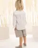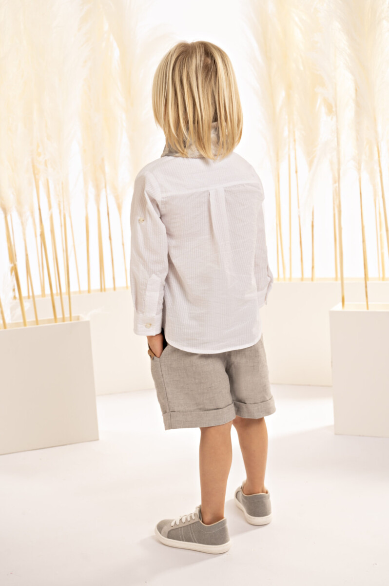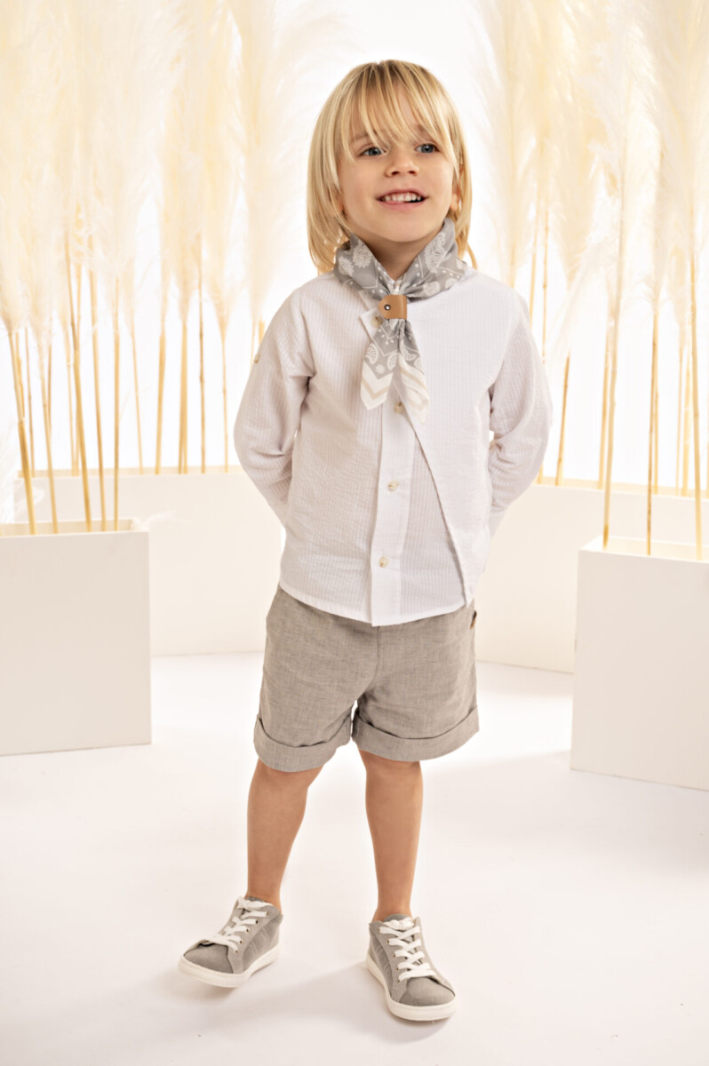 Μια φρέσκια πρόταση, ιδανική για σύγχρονες, ανάλαφρες εμφανίσεις. Ένα μοντέρνο σύνολο που αποτελείται από βερμούδα σε loose γραμμή από γκρι μελανζέ cotton-lino ύφασμα και βαμβακερό λευκό γκοφρέ πουκάμισο με mao γιακά και λοξό διπλό κούμπωμα . Το σετ συμπληρώνει άψογα το personalized βουάλ φουλάρι με τα λαχούρια σε μπεζ-γκρι απόχρωση, και το ψάθινο καπέλο ή τραγιάσκα (ανάλογα με την προτίμηση).