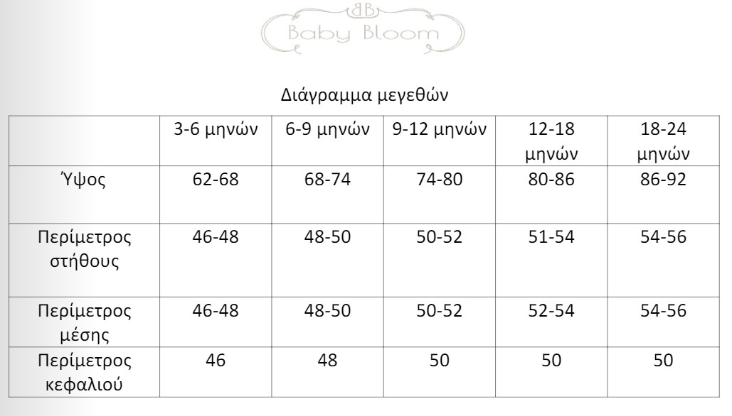 | Μέγεθος | 6-9 μηνών, 9-12 μηνών, 3-6 μηνών, 12-18 μηνών, 18-24 μηνών |
