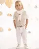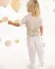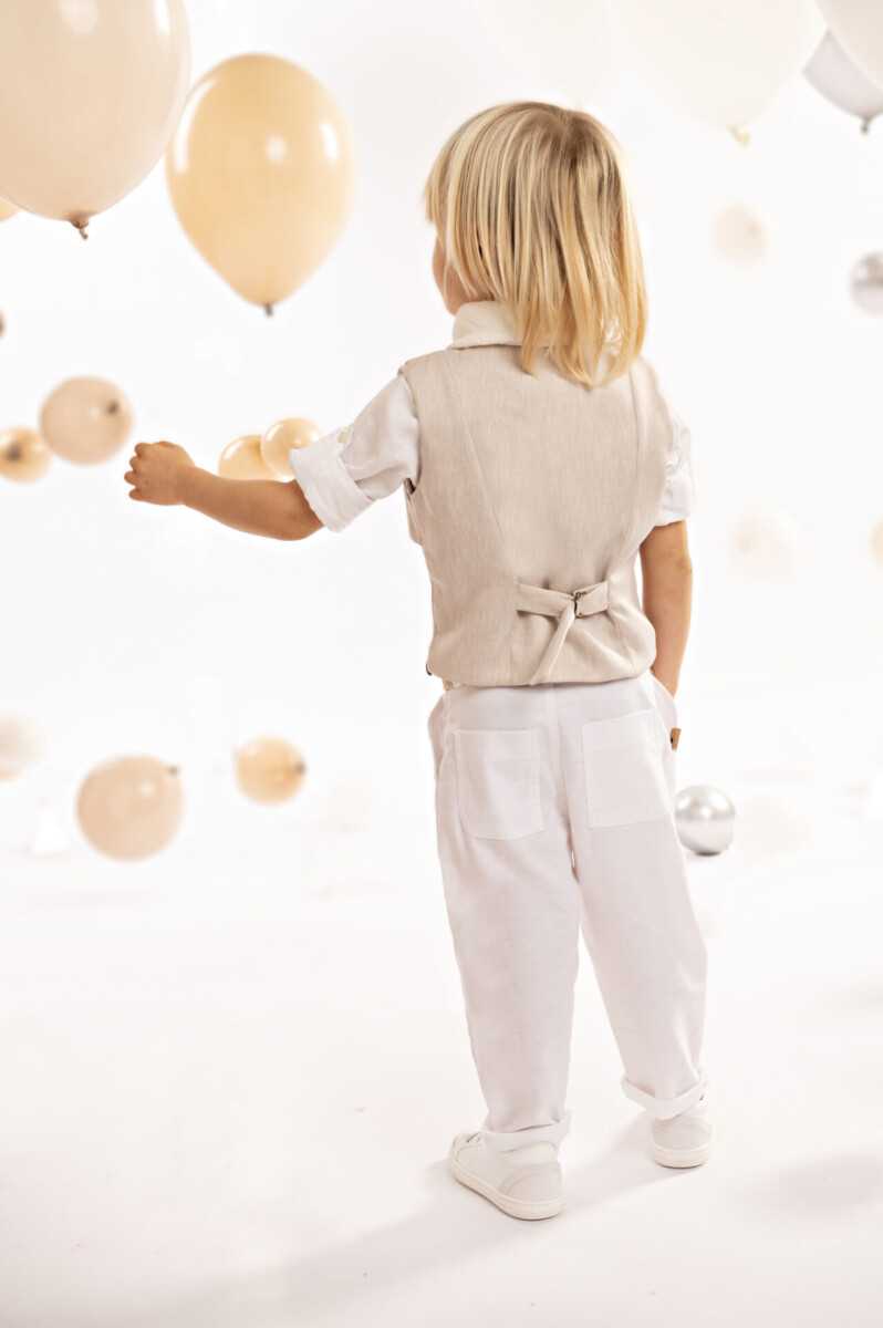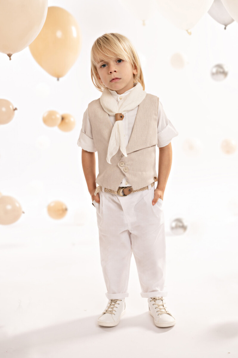 Ένα σύνολο που συνδυάζει την άνεση με τη μοντέρνα αισθητική. Το παντελόνι σε γραμμή baggy με λοξό κούμπωμα και εξωτερικές πίσω τσέπες, φτιαγμένο από λευκό tencel-lino-cotton ύφασμα. Το γιλέκο, με λοξό μονό ωμίτη από μελανζέ μαλακό τεχνικό diagonal ύφασμα, προσφέρει μια δυναμική και ταυτόχρονα κομψή αίσθηση. Το βαμβακερό πουκάμισο σε off white απόχρωση με ιδιαίτερο Μao γιακά ενισχύει τη φρεσκάδα του look. Το σετ ολοκληρώνεται με το φουλάρι σε off white απόχρωση από βαμβακερή υφαντή γάζα, ζώνη από υφαντό ιμάντα και το ψάθινο καπέλο (ή τραγιάσκα κατά επιλογή), προσφέροντας μία μοναδική επιλογή για τις ιδιαίτερες στιγμές σας.