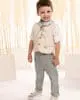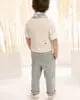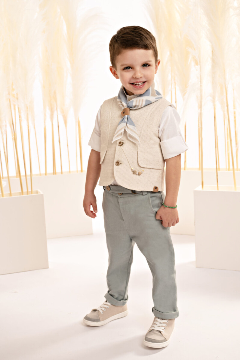 Ένα σύνολο γεμάτο φρεσκάδα με υπέροχο συνδυασμό χρωμάτων και υφών το οποίο αποτελείται από, παντελόνι με ιδιαίτερη λεπτομέρεια στο ζωνάκι από λινό σε mint χρώμα και γιλέκο σε κλασσική γραμμή με έξυπνα κοψίματα, φτιαγμένο από υπέροχο υφαντό ιταλικό ύφασμα σε εκρού απόχρωση. Το βαμβακερό πουκάμισο σε off white απόχρωση έχει έναν πολύ ιδιαίτερο Μao γιακά, ενώ το σύνολο ολοκληρώνεται άψογα με το personalized βουάλ φουλάρι με γεωμετρικά σχέδια σε μπεζ-σιέλ απόχρωση και το ψάθινο καπέλο (ή τραγιάσκα κατά επιλογή).