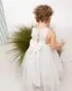 - Εκρού φόρεμα με ασσύμετρη φούστα με στολισμό από χειροποίητα λουλούδια και κεντημένη δαντέλα. Chantilly στο μπούστο και σε ένα μέρος της φούστας.