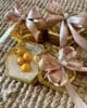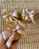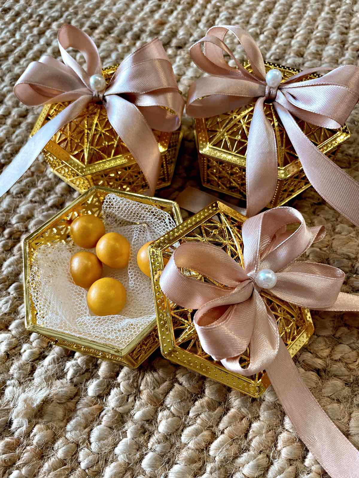 Χρυσή μπιζουτιέρα από σκληρό πλαστικό με φωλιά τούλι εσωτερικά και 5 κουφέτα περλέ Χατζηγιαννάκης