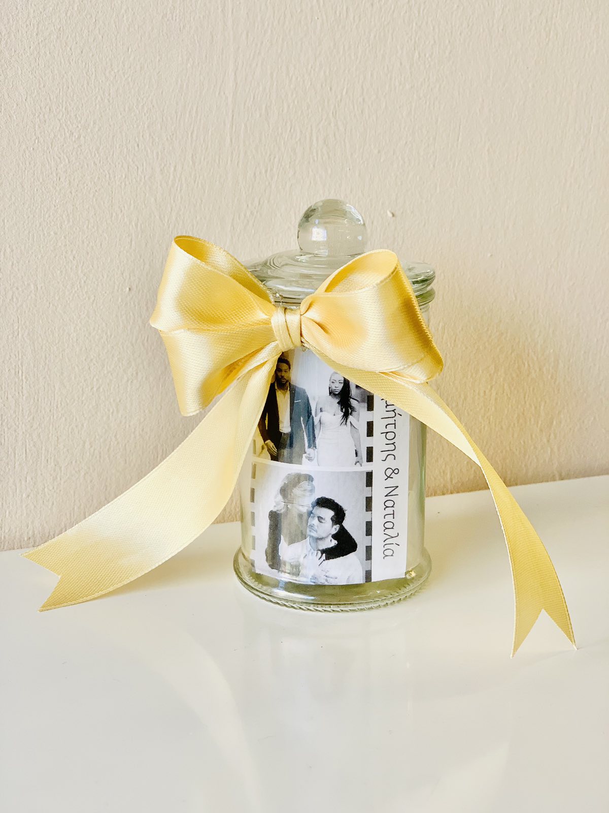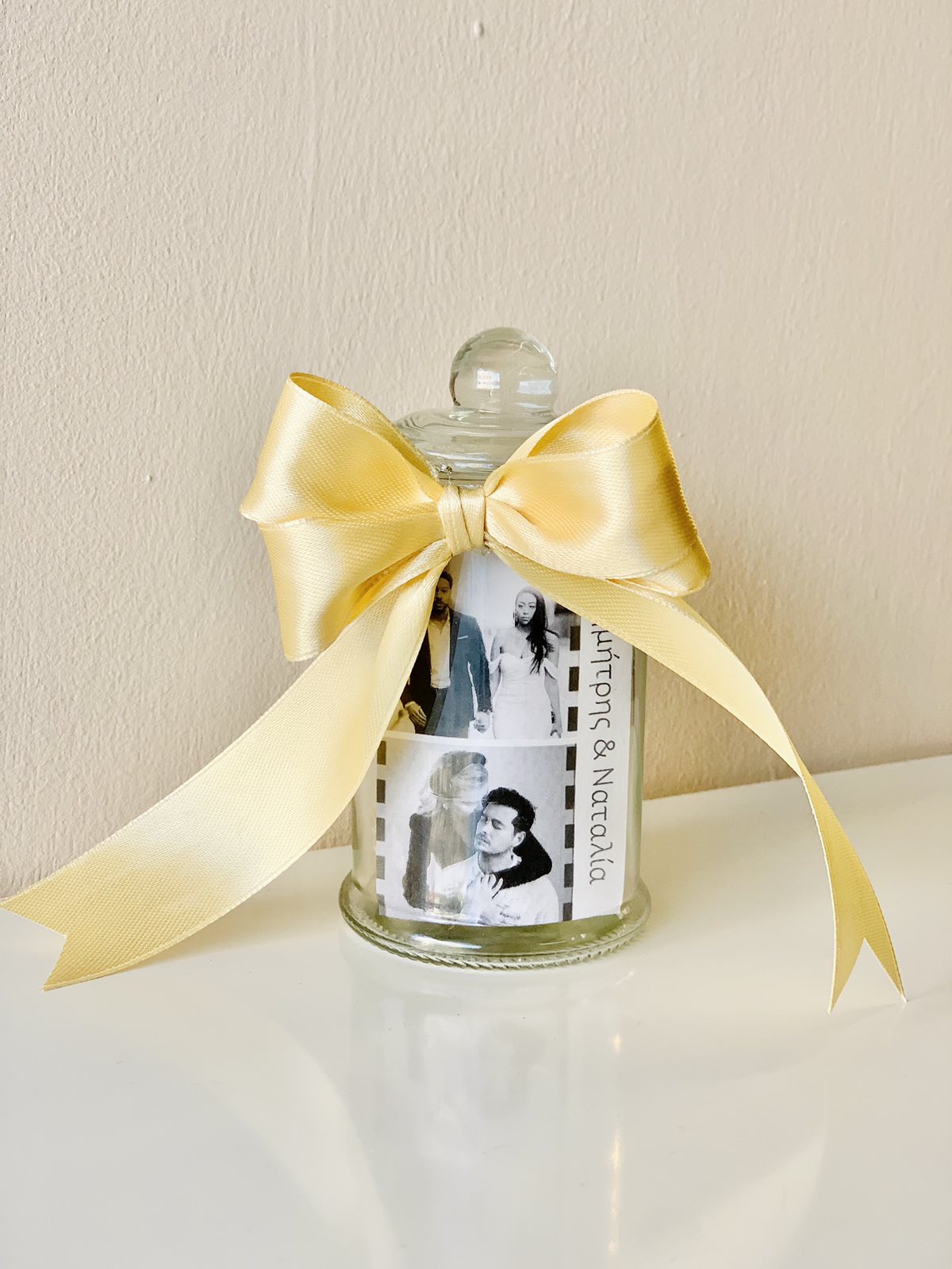Γυάλινο δοχείο με 5 κουφέτα Χατζηγιαννάκη και φωτογραφίες της επιλογής σας.