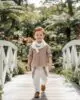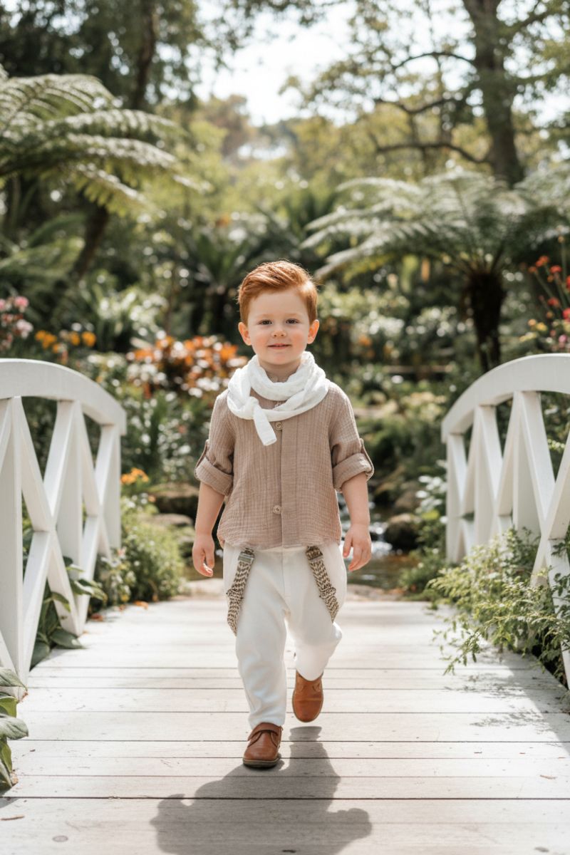 Ρομαντικό βαπτιστικό σύνολο με φυσική κομψότητα. Πουκαμίσα από βαμβάκι με ανάλαφρη υφή. Παντελόνι από βαμβακερό ύφασμα υψηλής αντοχής. Τιράντες που προσφέρουν σωστή εφαρμογή και κομψότητα. Ελαφρύ αξεσουάρ λαιμού που συμπληρώνει το look