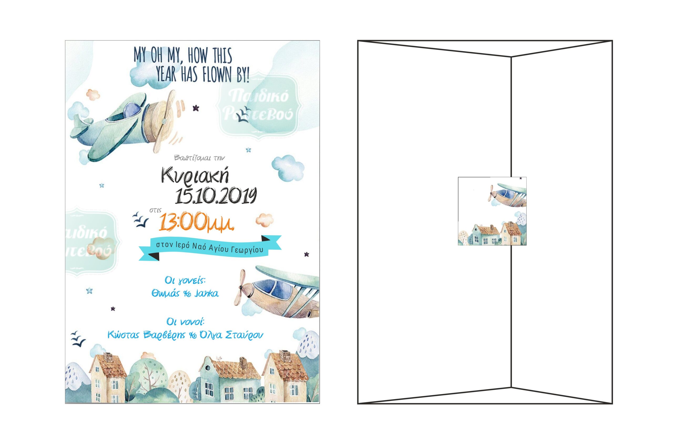 2 επιλογή) προσκλητήριο 220γρ + φάκελος λευκός 20cm x 14cm + αυτοκόλλητο στο ίδιο θέμα για να κλείσει ο φάκελος. Τιμή τεμαχίου 1,40€