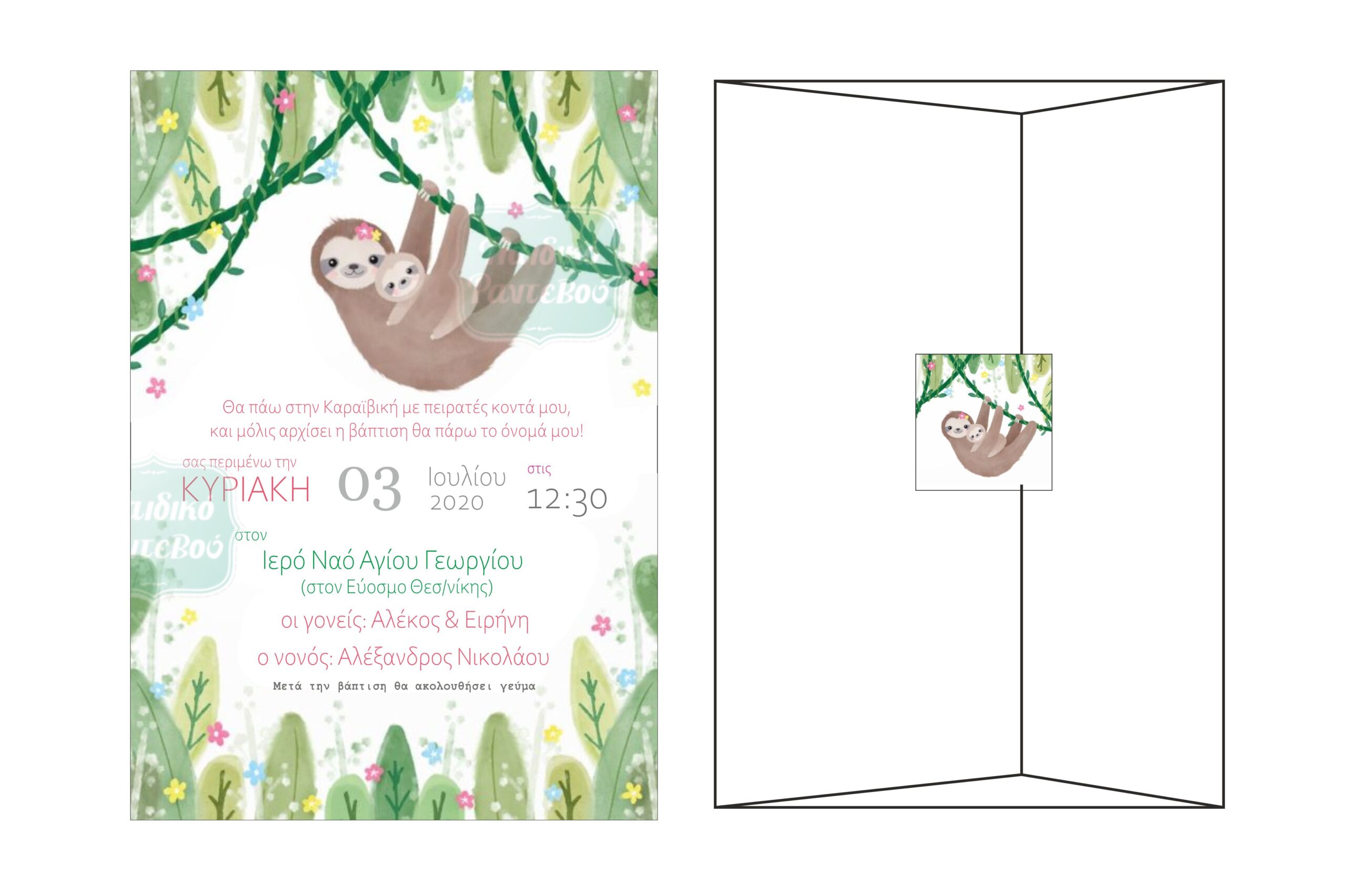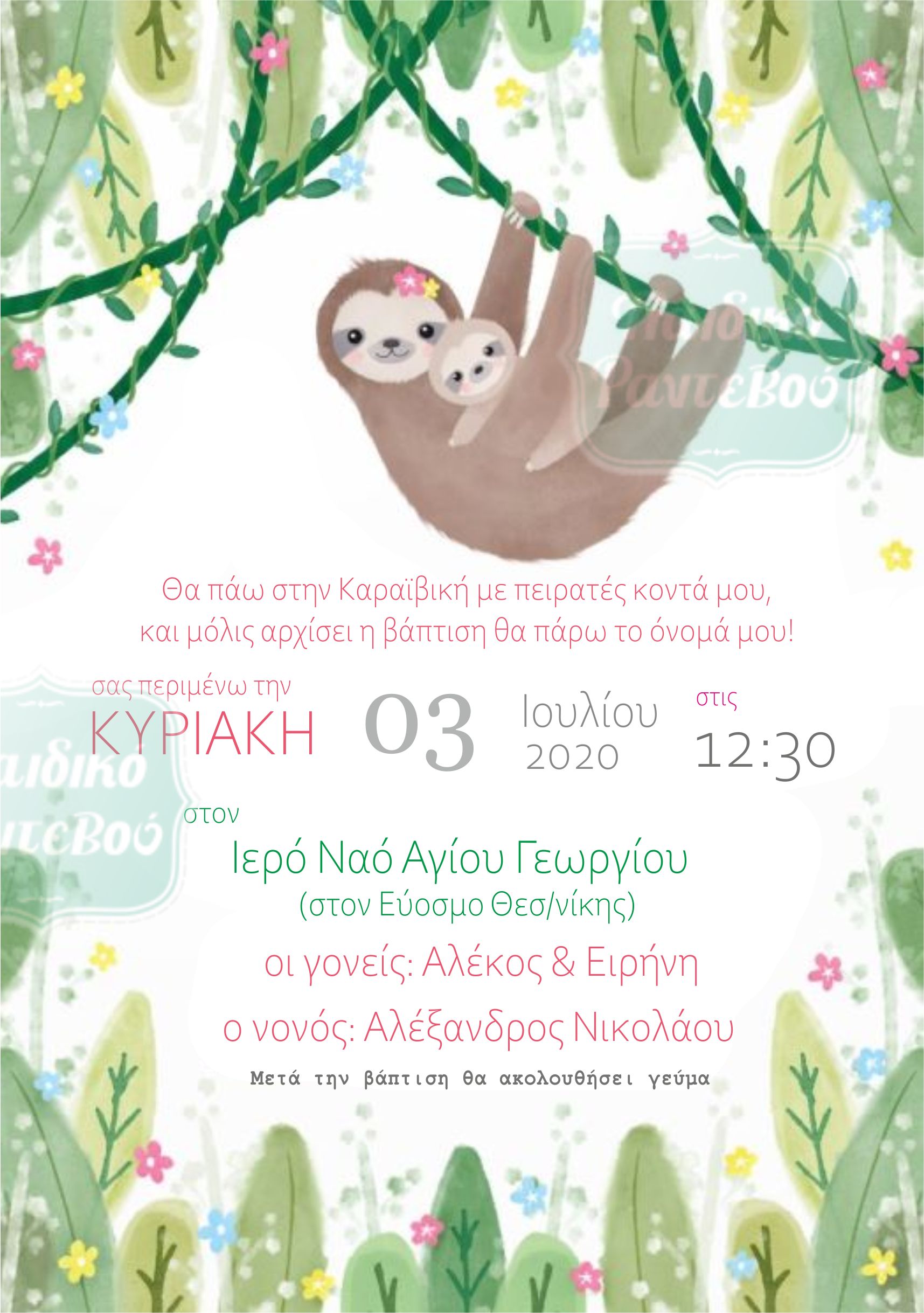 Προσκλητήριο Βάπτισης με θέμα βραδύπους το οποίο βγαίνει και για αγόρι και για κορίτσι (απλά με διαφορετικά χρώματα γραμμάτων)