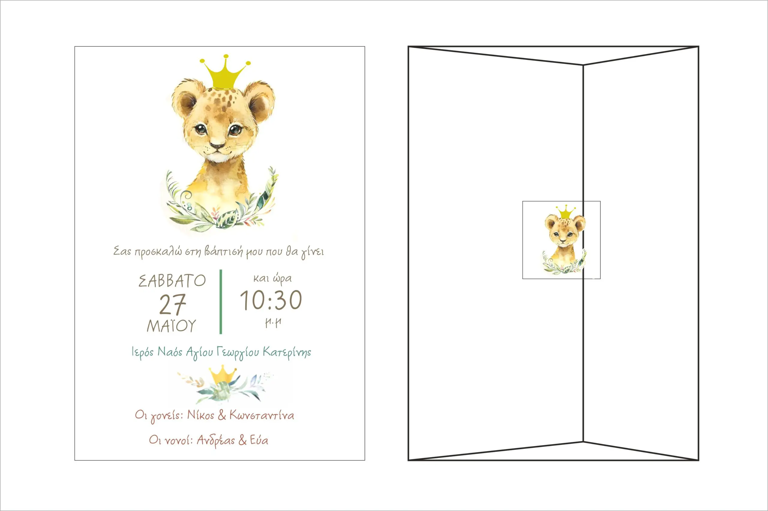 Προσκλητήριο Βάπτισης με θέμα λιονταράκι με κορώνα.