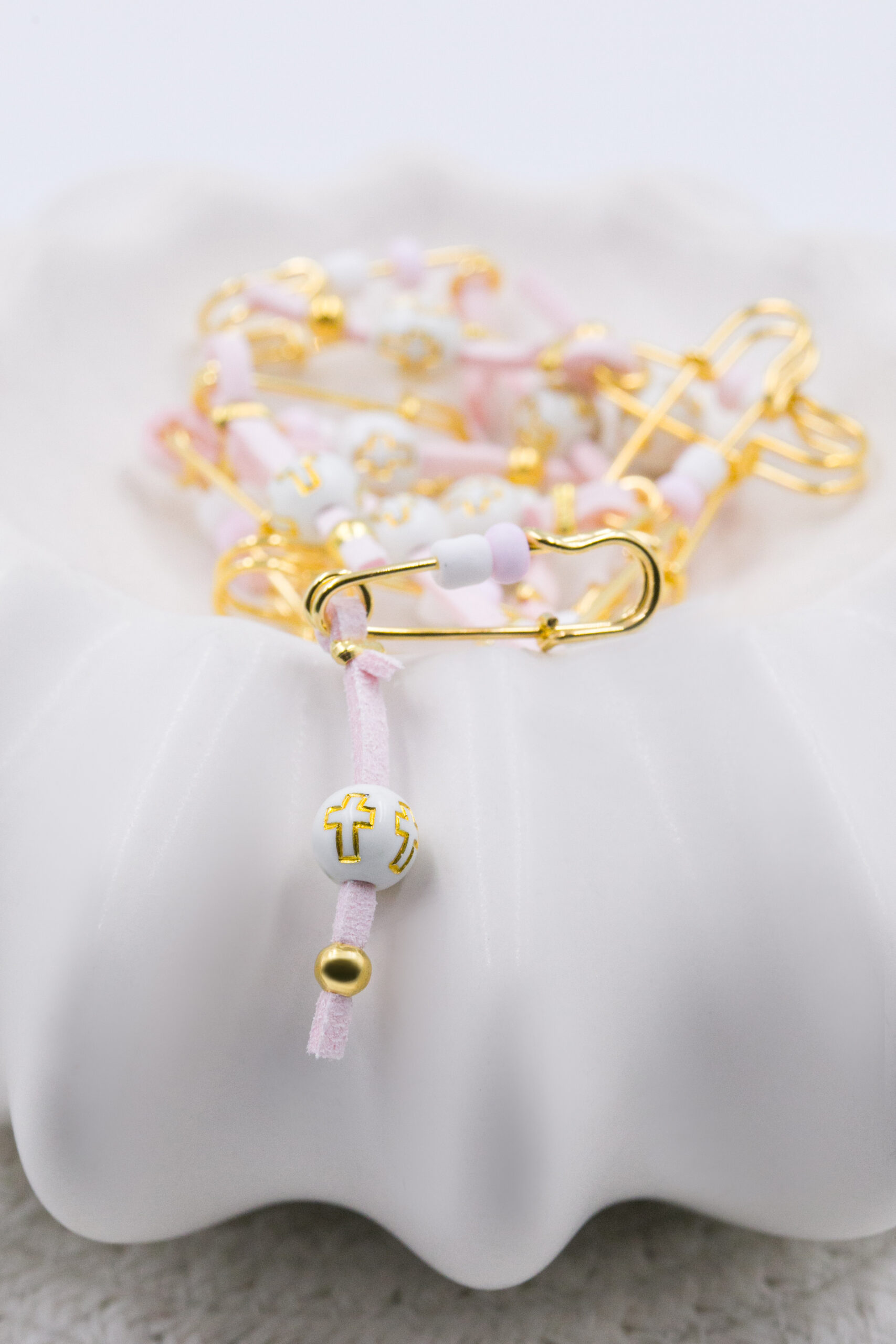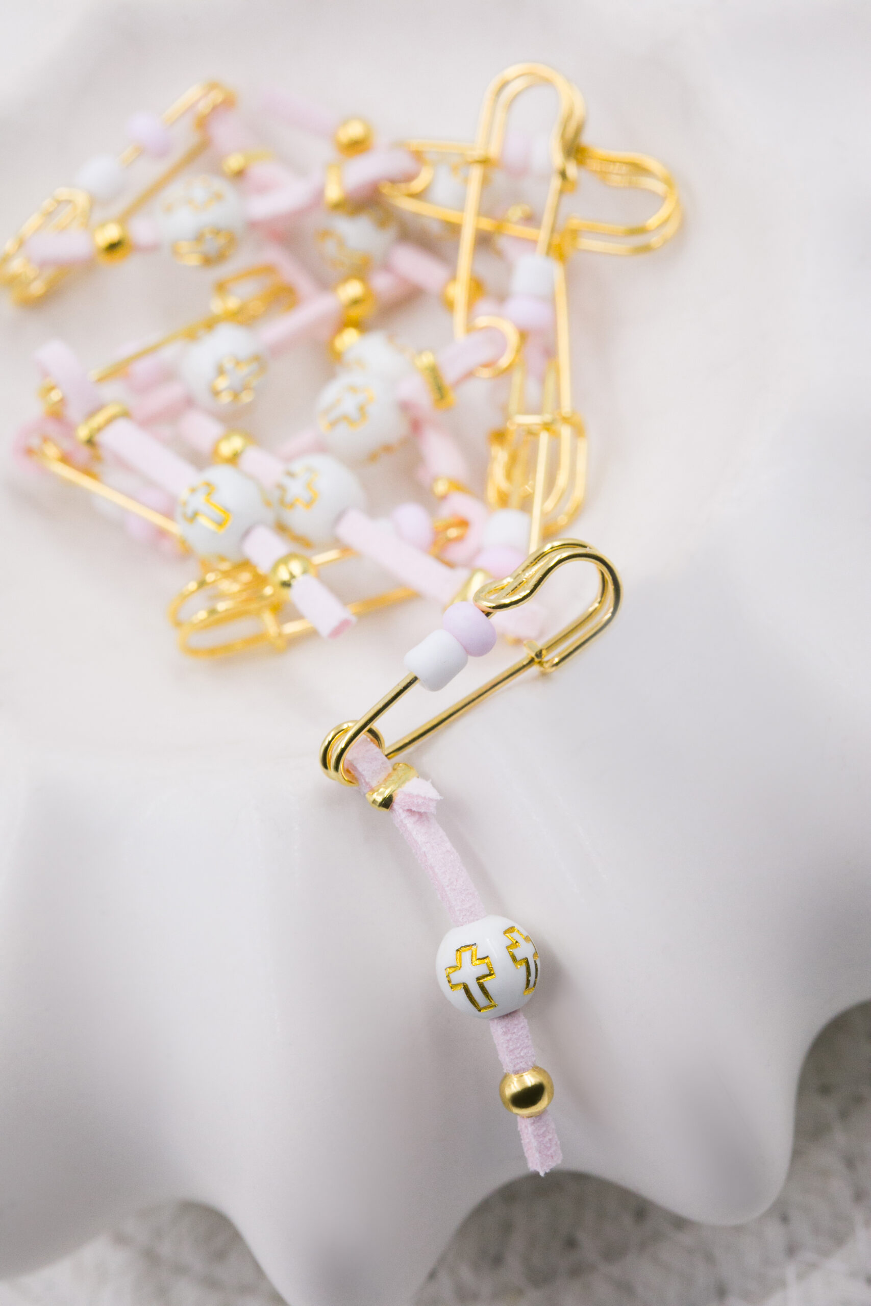 Μαρτυρικό καρφίτσα χάντρες λευκές ροζ ακρυλικός σταυρός και σουέτ δέρμα. Οι φωτογραφίες έχουν υποστεί επεξεργασία και τα χρώματα ίσως να διαφέρουν λίγο στην πραγματικότητα. Η τιμή αφορά συσκευασία 50 τεμαχίων.
