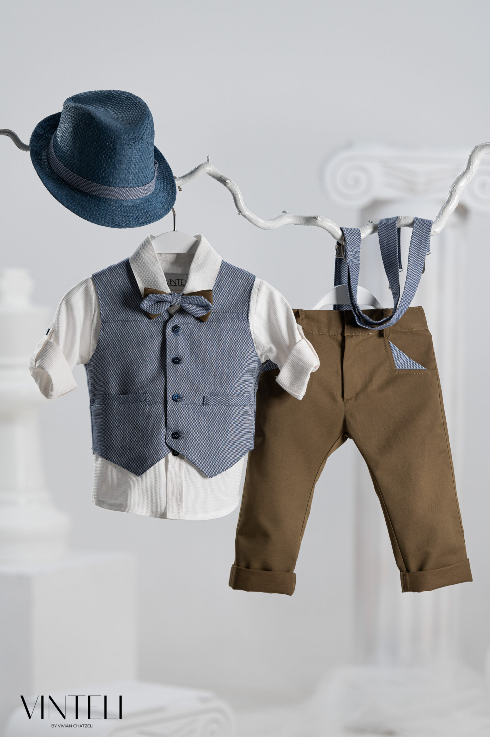 Trois-pièces με γαλάζιο-ραφ γιλέκο με ιδιαίτερες λεπτομέρειες στην ύφανση, λευκό βαμβακερό πουκάμισο και καφέ-λαδί παντελόνι. Συνοδεύεται από διπλό χειροποίητο παπιγιόν στα υφάσματα του σετ, τιράντες στην απόχρωση του γιλέκου με κουμπώματα από μπλε δερματίνη και ψάθινο καβουράκι. Σετ 6 τεμαχίων.